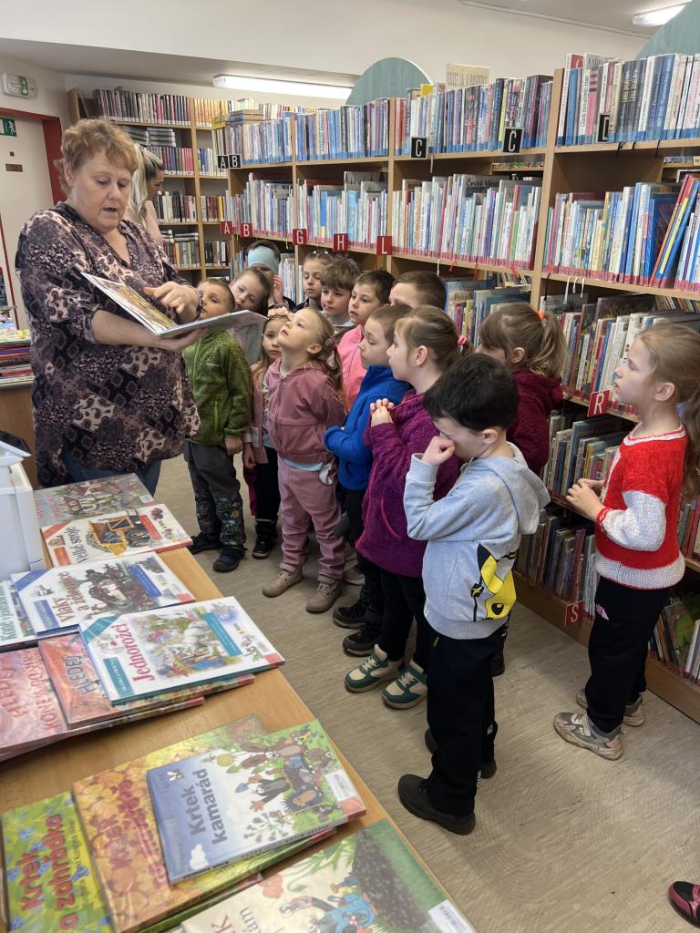 Děti ze tříd Berušky, Motýlci a Včelky se vystřídaly v knihovně, aby si prohlédly knihy, a taky jsme si trošku zasoutěžili. Děti hádaly pohádkové postavičky a zvířátka. Odměnou jim bylo lízátko a předškoláci dostali dárek v podobě batůžku s knihou a drobnými dárky z grantu Moravskoslezského kraje.