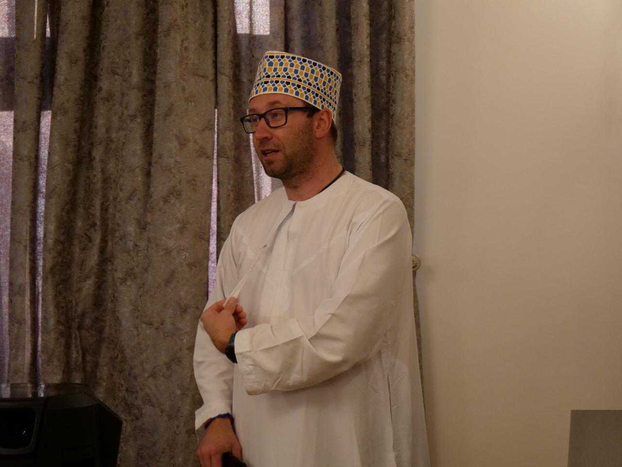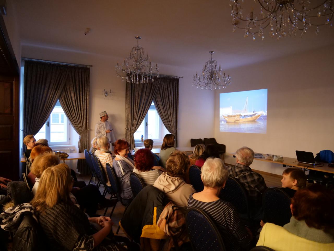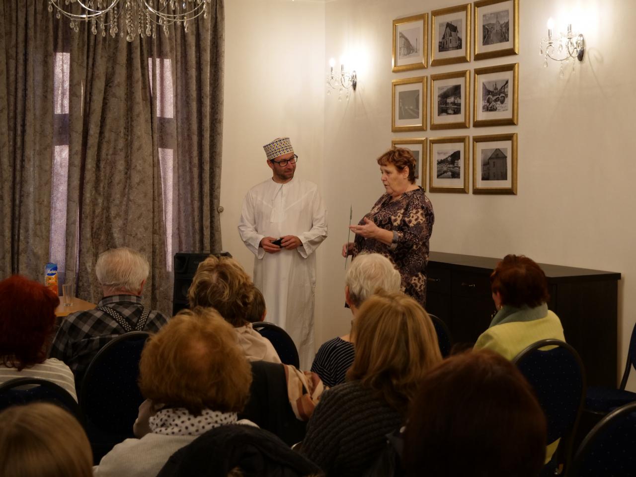 Omán, už jen létající koberec byl název cestovatelské přednášky, která se uskutečnila v úterý 28. 2. v Měšťanském domě. Pan Michal Štěpánek, který nám o své cestě po Ománu poutavě vyprávěl, nám i promítl spoustu krásných fotografií. Představil nám i tradiční mužské oblečení, ve kterém celou přednášku uváděl. Na závěr si posluchači mohli vyzkoušet tradiční muslimské čepice a došlo i na fotografování s panem Štěpánkem. Přednáška se všem moc líbila.